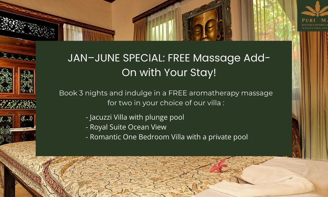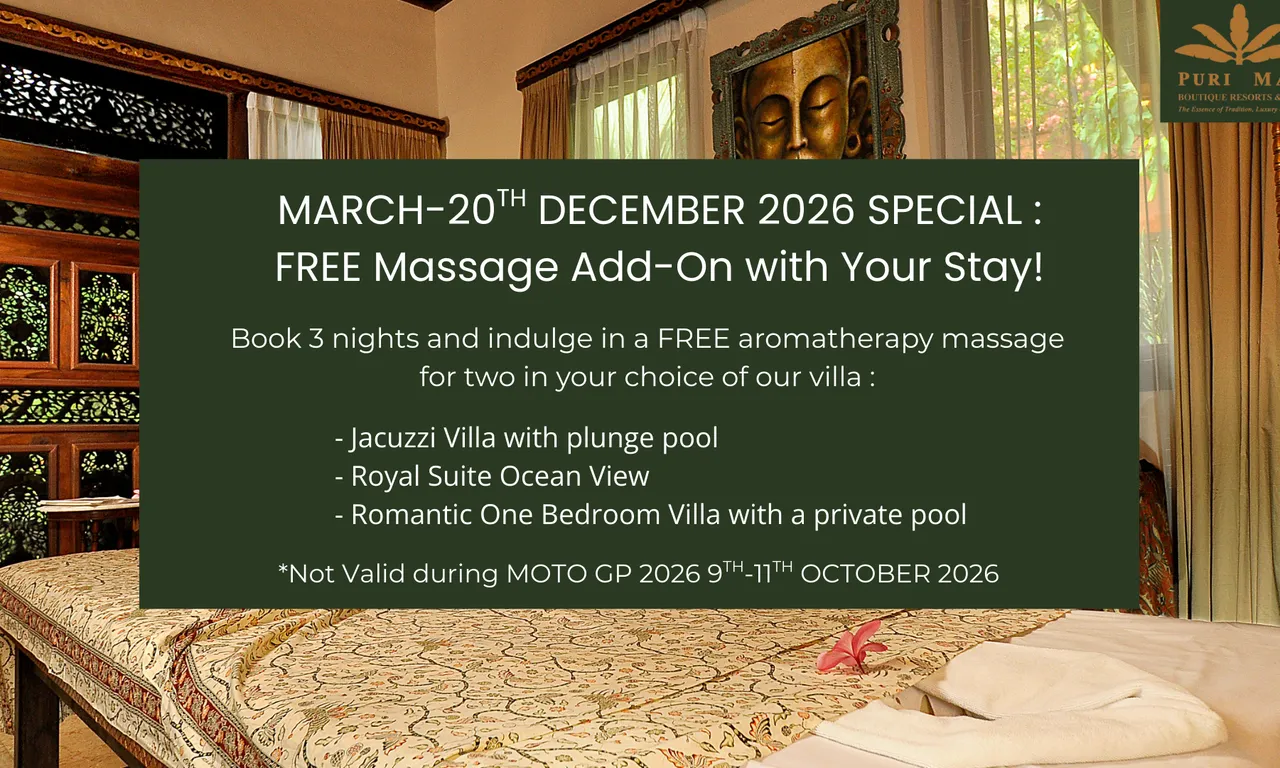 Puri Mas Spa & Wellness Center is located just 2 km. from the beach. Delight in our award winning spa-facilities surrounded by one acre of magnificent tropical gardens. Unwind during a specialised therapy or just enjoy the change of vista in a completely private environment. Complimentary transport is available on request between our 2 resorts.